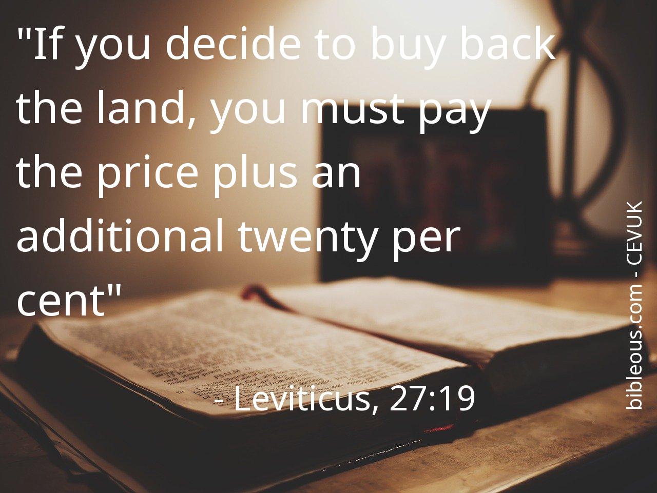 Despite everything, no word written in the Bible is superfluous. No word is missing. The word of the Lord is found in the Holy Scriptures, either in the 'Contemporary English Version Anglicised 2012 ' or in any other version of the Bible. Therefore, reflecting on the verse Leviticus, 27:19 of the chapter 27 of the book Leviticus, helps us to be better Christians and to get closer to God. It is good to turn to the verse Leviticus, 27:19 on all those occasions when it can serve as a guide to know how to act or to bring peace to our hearts.