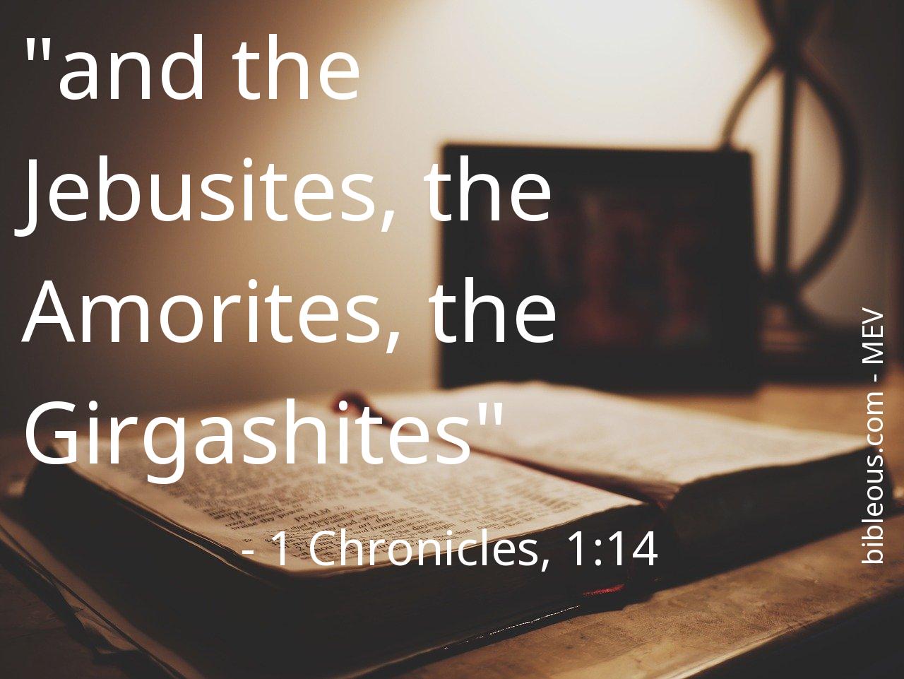 The verse 1 Chronicles, 1:14 of the chapter 1 that presents us with the version 'Modern English Version ' of the Bible is very interesting to carry out a reflective reading and try to deepen the wisdom of its words. What did God want to tell us with the verse 1 Chronicles, 1:14? The chapter 1 consists of 54 of verses, which can help to contextualize and offer better references to understand what the Father wants to tell us in the verse 1 Chronicles, 1:14.