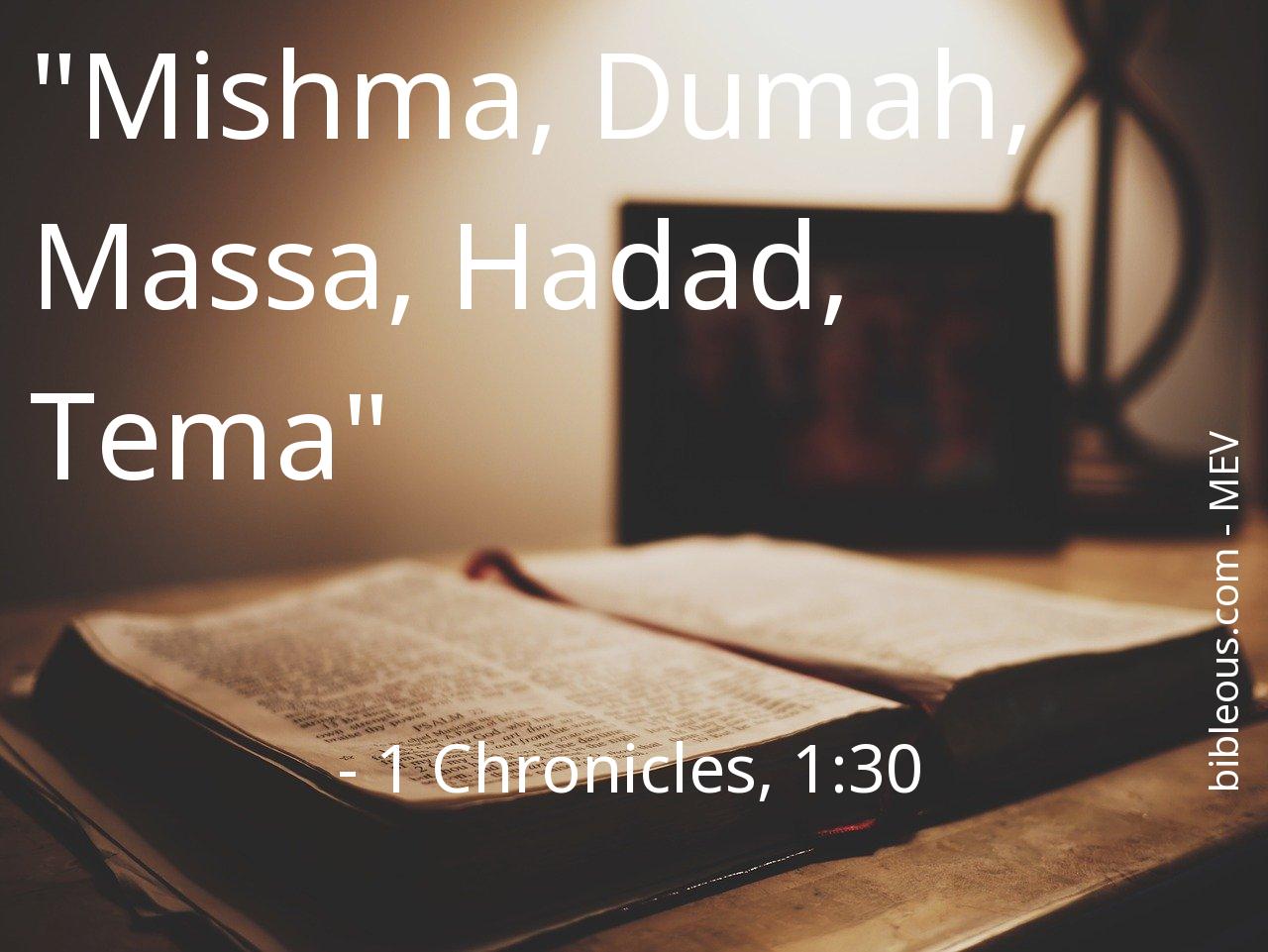 Despite everything, no word written in the Bible is superfluous. No word is missing. The word of the Lord is found in the Holy Scriptures, either in the 'Modern English Version ' or in any other version of the Bible. Therefore, reflecting on the verse 1 Chronicles, 1:30 of the chapter 1 of the book 1 Chronicles, helps us to be better Christians and to get closer to God. It is good to turn to the verse 1 Chronicles, 1:30 on all those occasions when it can serve as a guide to know how to act or to bring peace to our hearts.