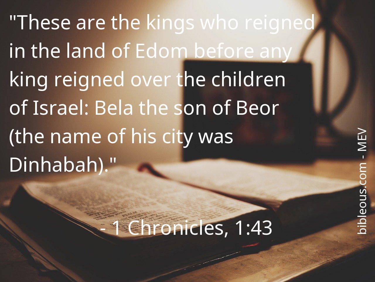 The verse 1 Chronicles, 1:43 of the chapter 1 that presents us with the version 'Modern English Version ' of the Bible is very interesting to carry out a reflective reading and try to deepen the wisdom of its words. What did God want to tell us with the verse 1 Chronicles, 1:43? The chapter 1 consists of 54 of verses, which can help to contextualize and offer better references to understand what the Father wants to tell us in the verse 1 Chronicles, 1:43.