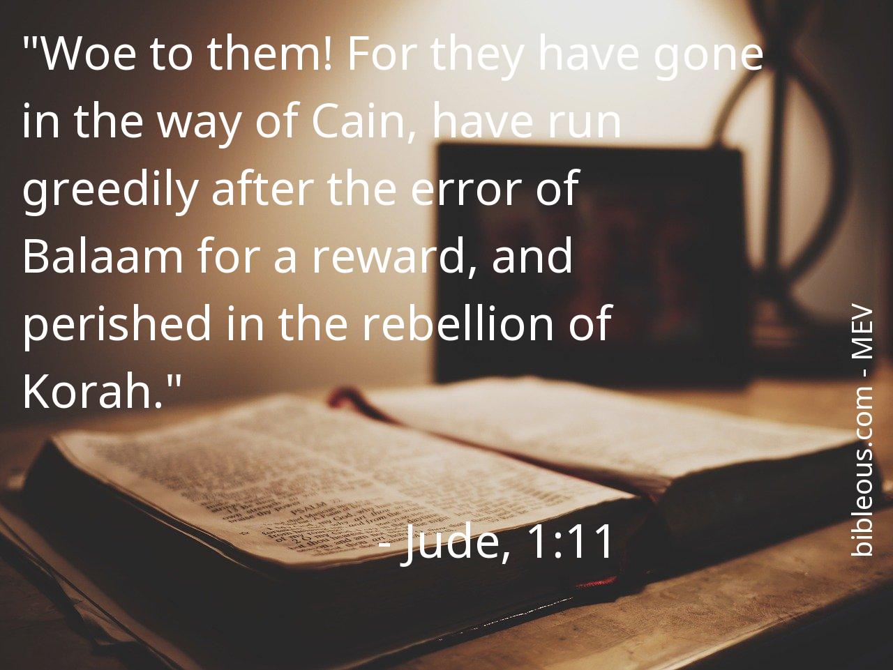 Despite everything, no word written in the Bible is superfluous. No word is missing. The word of the Lord is found in the Holy Scriptures, either in the 'Modern English Version ' or in any other version of the Bible. Therefore, reflecting on the verse Jude, 1:11 of the chapter 1 of the book Jude, helps us to be better Christians and to get closer to God. It is good to turn to the verse Jude, 1:11 on all those occasions when it can serve as a guide to know how to act or to bring peace to our hearts.