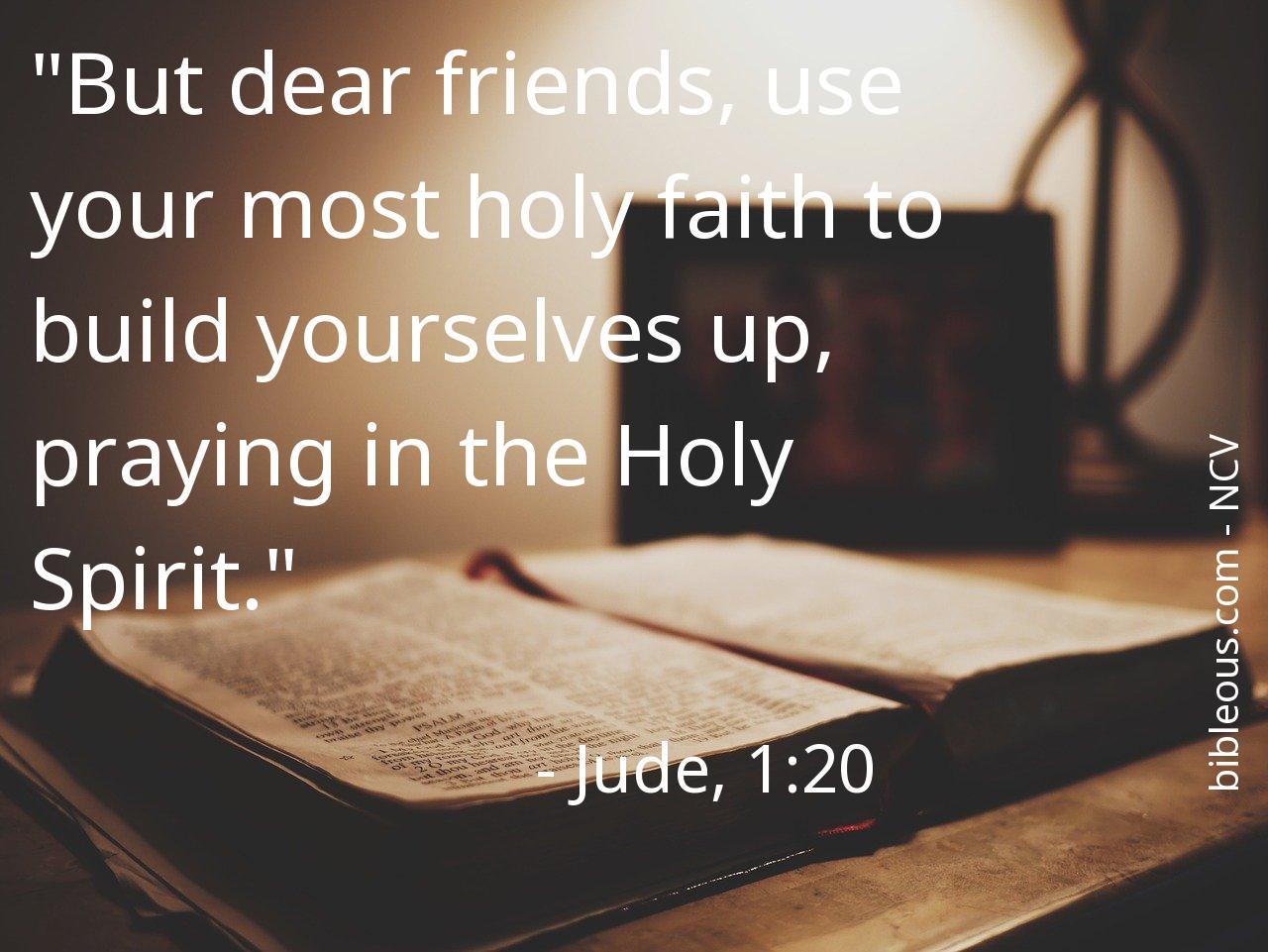 The verse Jude, 1:20 of the chapter 1 that presents us with the version 'New Century Version ' of the Bible is very interesting to carry out a reflective reading and try to deepen the wisdom of its words. What did God want to tell us with the verse Jude, 1:20? The chapter 1 consists of 25 of verses, which can help to contextualize and offer better references to understand what the Father wants to tell us in the verse Jude, 1:20.
