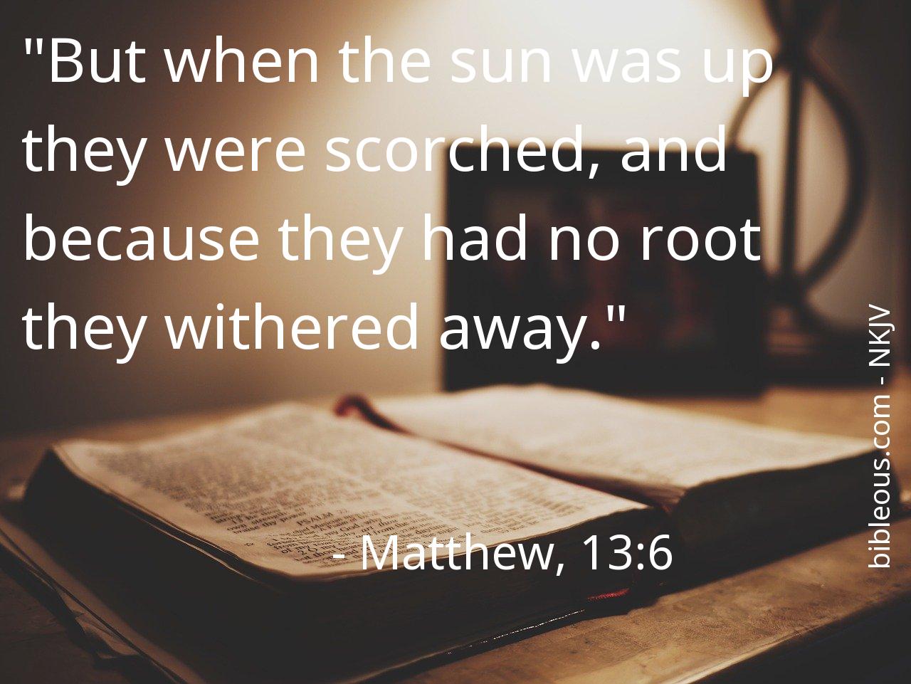 Despite everything, no word written in the Bible is superfluous. No word is missing. The word of the Lord is found in the Holy Scriptures, either in the 'New King James Version ' or in any other version of the Bible. Therefore, reflecting on the verse Matthew, 13:6 of the chapter 13 of the book Matthew, helps us to be better Christians and to get closer to God. It is good to turn to the verse Matthew, 13:6 on all those occasions when it can serve as a guide to know how to act or to bring peace to our hearts.
