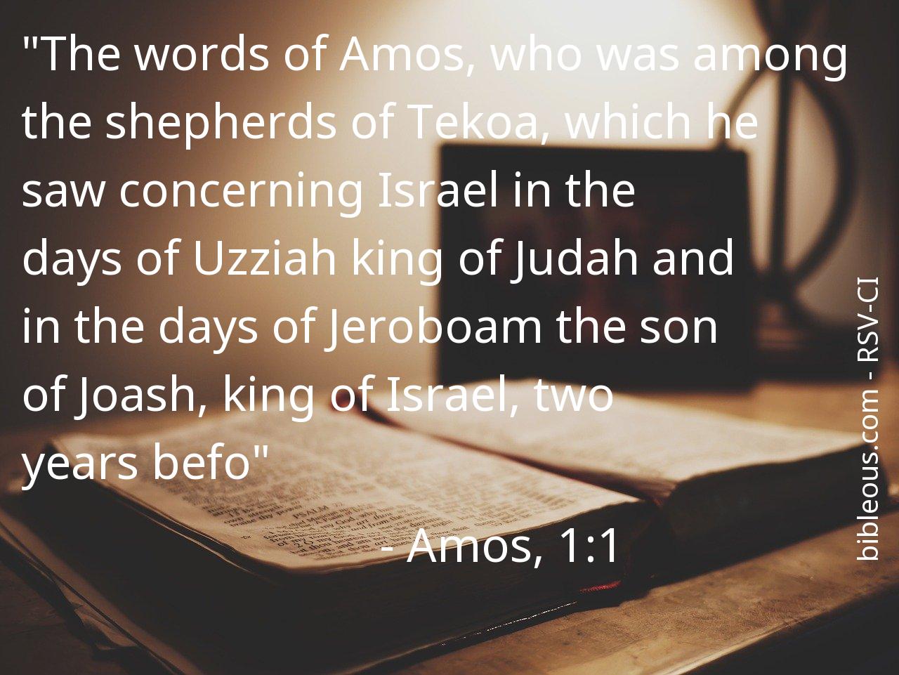 Despite everything, no word written in the Bible is superfluous. No word is missing. The word of the Lord is found in the Holy Scriptures, either in the 'Revised Standard Version ' or in any other version of the Bible. Therefore, reflecting on the verse Amos, 1:1 of the chapter 1 of the book Amos, helps us to be better Christians and to get closer to God. It is good to turn to the verse Amos, 1:1 on all those occasions when it can serve as a guide to know how to act or to bring peace to our hearts.