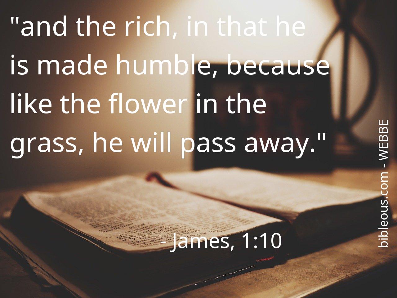 Despite everything, no word written in the Bible is superfluous. No word is missing. The word of the Lord is found in the Holy Scriptures, either in the 'World English Bible British Edition ' or in any other version of the Bible. Therefore, reflecting on the verse James, 1:10 of the chapter 1 of the book James, helps us to be better Christians and to get closer to God. It is good to turn to the verse James, 1:10 on all those occasions when it can serve as a guide to know how to act or to bring peace to our hearts.
