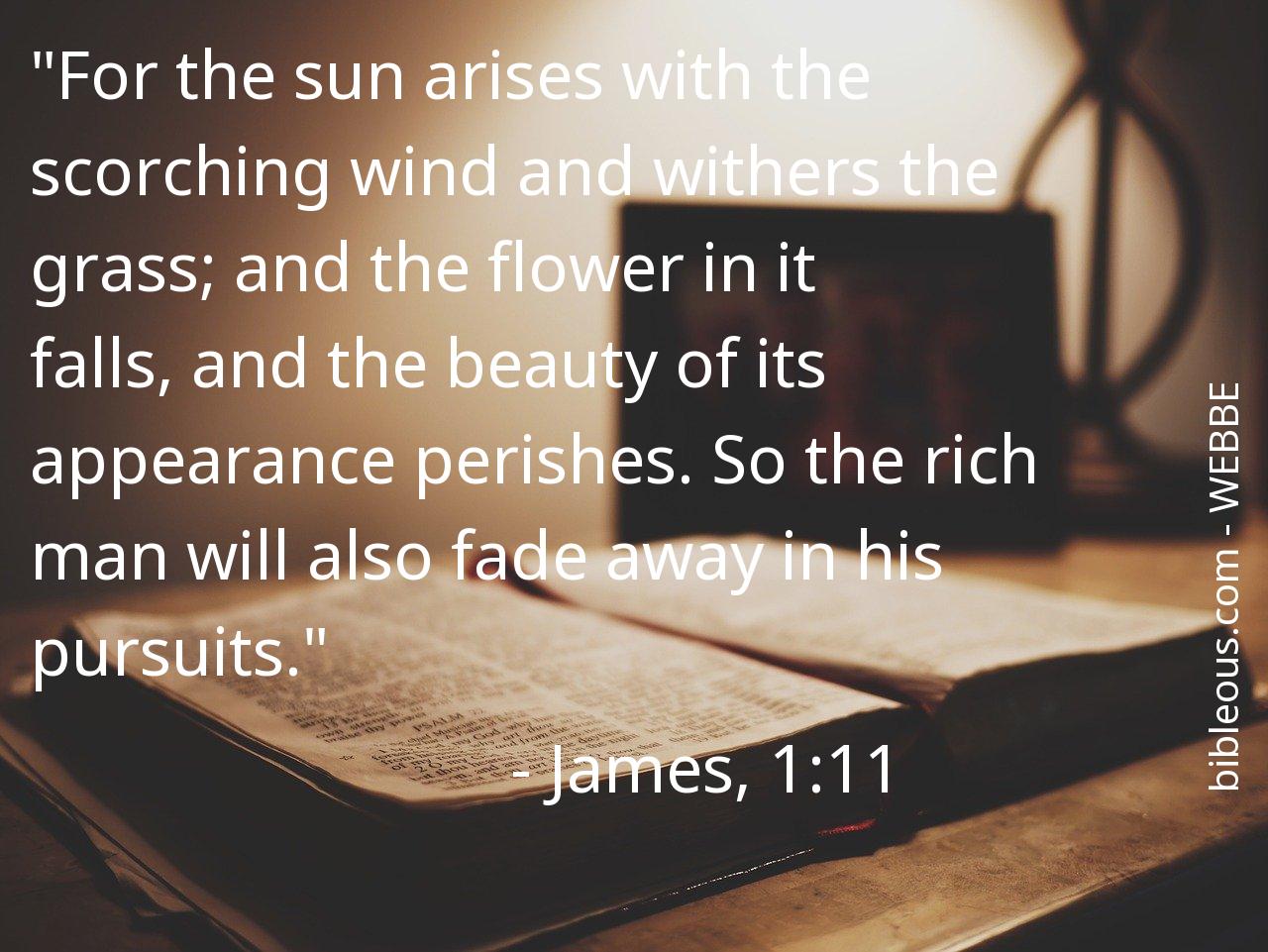 Despite everything, no word written in the Bible is superfluous. No word is missing. The word of the Lord is found in the Holy Scriptures, either in the 'World English Bible British Edition ' or in any other version of the Bible. Therefore, reflecting on the verse James, 1:11 of the chapter 1 of the book James, helps us to be better Christians and to get closer to God. It is good to turn to the verse James, 1:11 on all those occasions when it can serve as a guide to know how to act or to bring peace to our hearts.