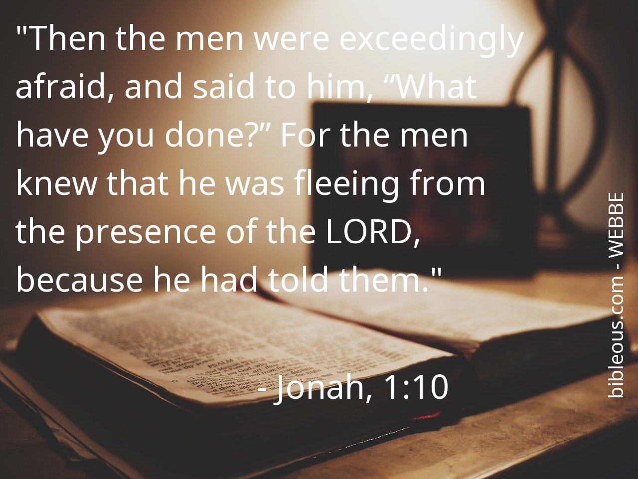 Despite everything, no word written in the Bible is superfluous. No word is missing. The word of the Lord is found in the Holy Scriptures, either in the 'World English Bible British Edition ' or in any other version of the Bible. Therefore, reflecting on the verse Jonah, 1:10 of the chapter 1 of the book Jonah, helps us to be better Christians and to get closer to God. It is good to turn to the verse Jonah, 1:10 on all those occasions when it can serve as a guide to know how to act or to bring peace to our hearts.