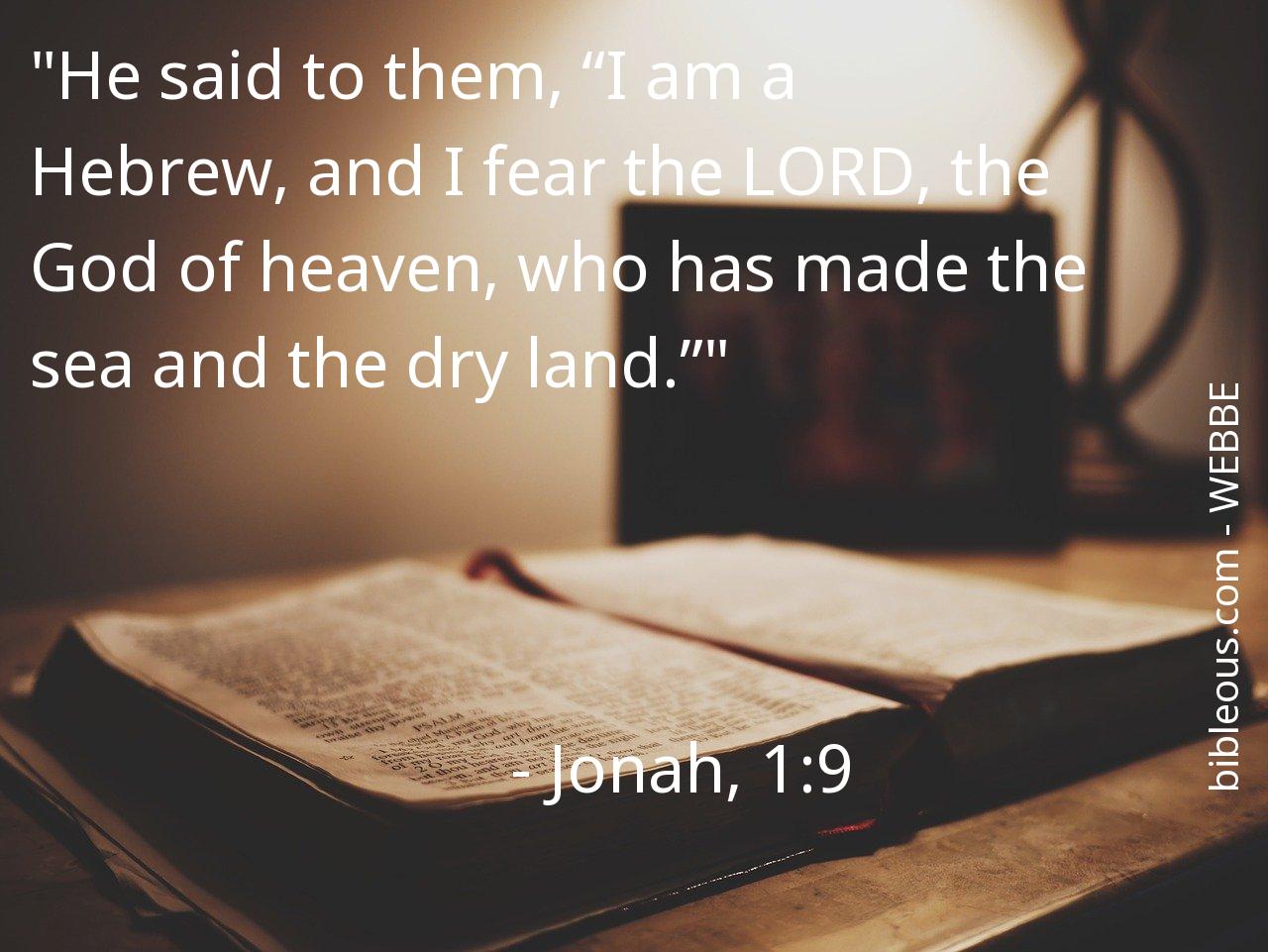 Despite everything, no word written in the Bible is superfluous. No word is missing. The word of the Lord is found in the Holy Scriptures, either in the 'World English Bible British Edition ' or in any other version of the Bible. Therefore, reflecting on the verse Jonah, 1:9 of the chapter 1 of the book Jonah, helps us to be better Christians and to get closer to God. It is good to turn to the verse Jonah, 1:9 on all those occasions when it can serve as a guide to know how to act or to bring peace to our hearts.