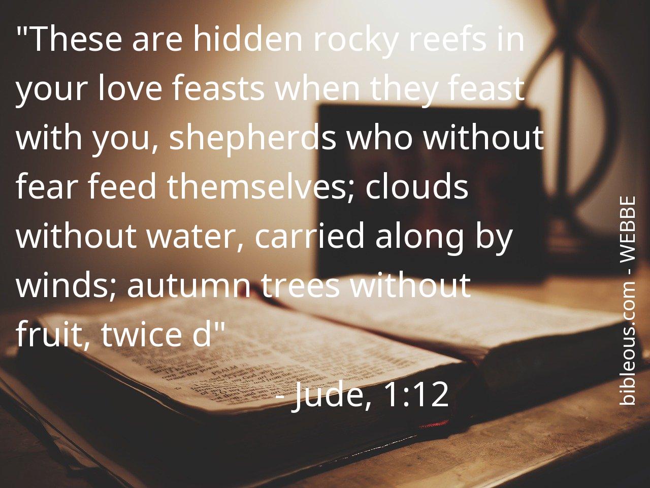 Despite everything, no word written in the Bible is superfluous. No word is missing. The word of the Lord is found in the Holy Scriptures, either in the 'World English Bible British Edition ' or in any other version of the Bible. Therefore, reflecting on the verse Jude, 1:12 of the chapter 1 of the book Jude, helps us to be better Christians and to get closer to God. It is good to turn to the verse Jude, 1:12 on all those occasions when it can serve as a guide to know how to act or to bring peace to our hearts.