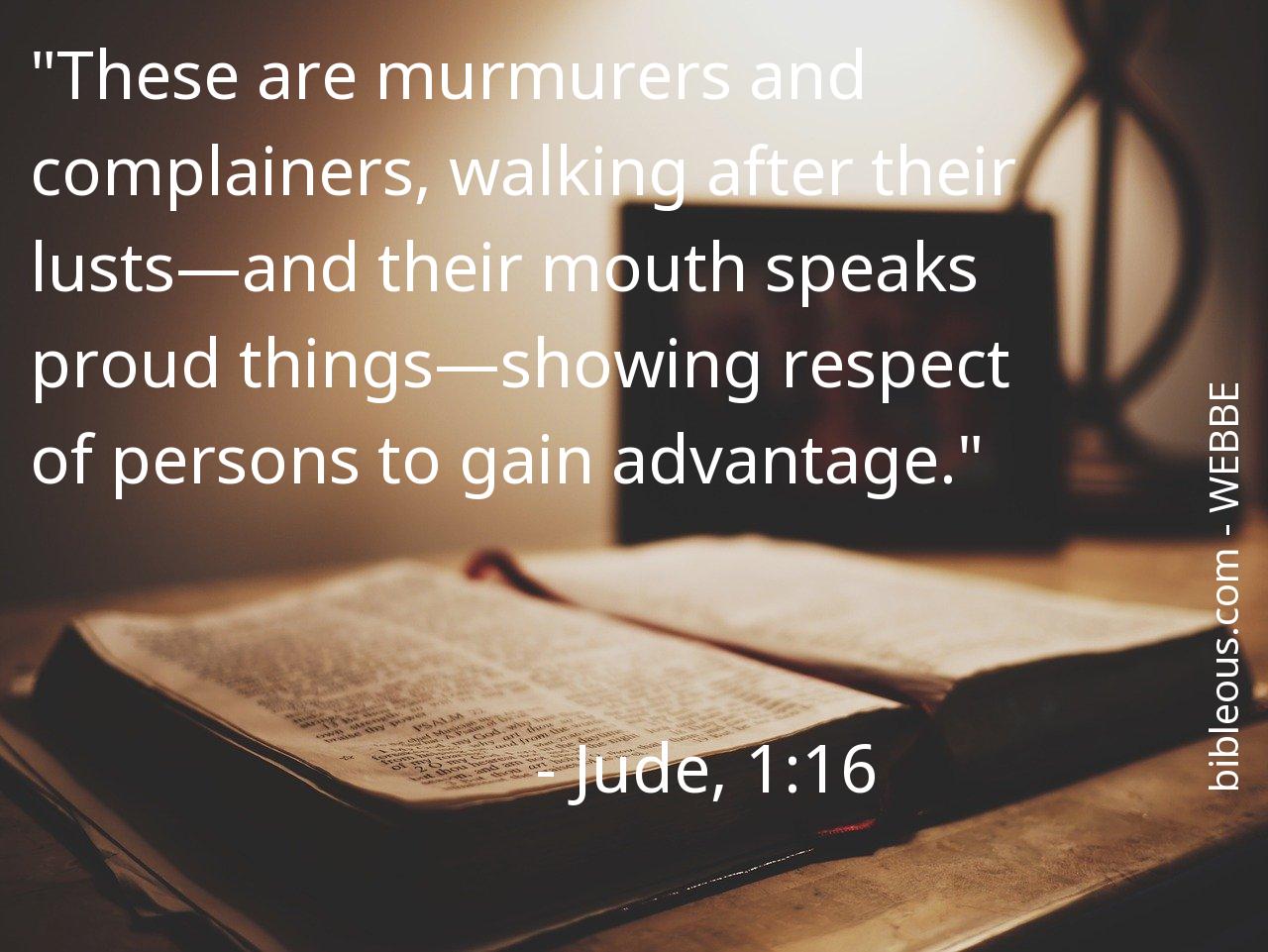 Despite everything, no word written in the Bible is superfluous. No word is missing. The word of the Lord is found in the Holy Scriptures, either in the 'World English Bible British Edition ' or in any other version of the Bible. Therefore, reflecting on the verse Jude, 1:16 of the chapter 1 of the book Jude, helps us to be better Christians and to get closer to God. It is good to turn to the verse Jude, 1:16 on all those occasions when it can serve as a guide to know how to act or to bring peace to our hearts.