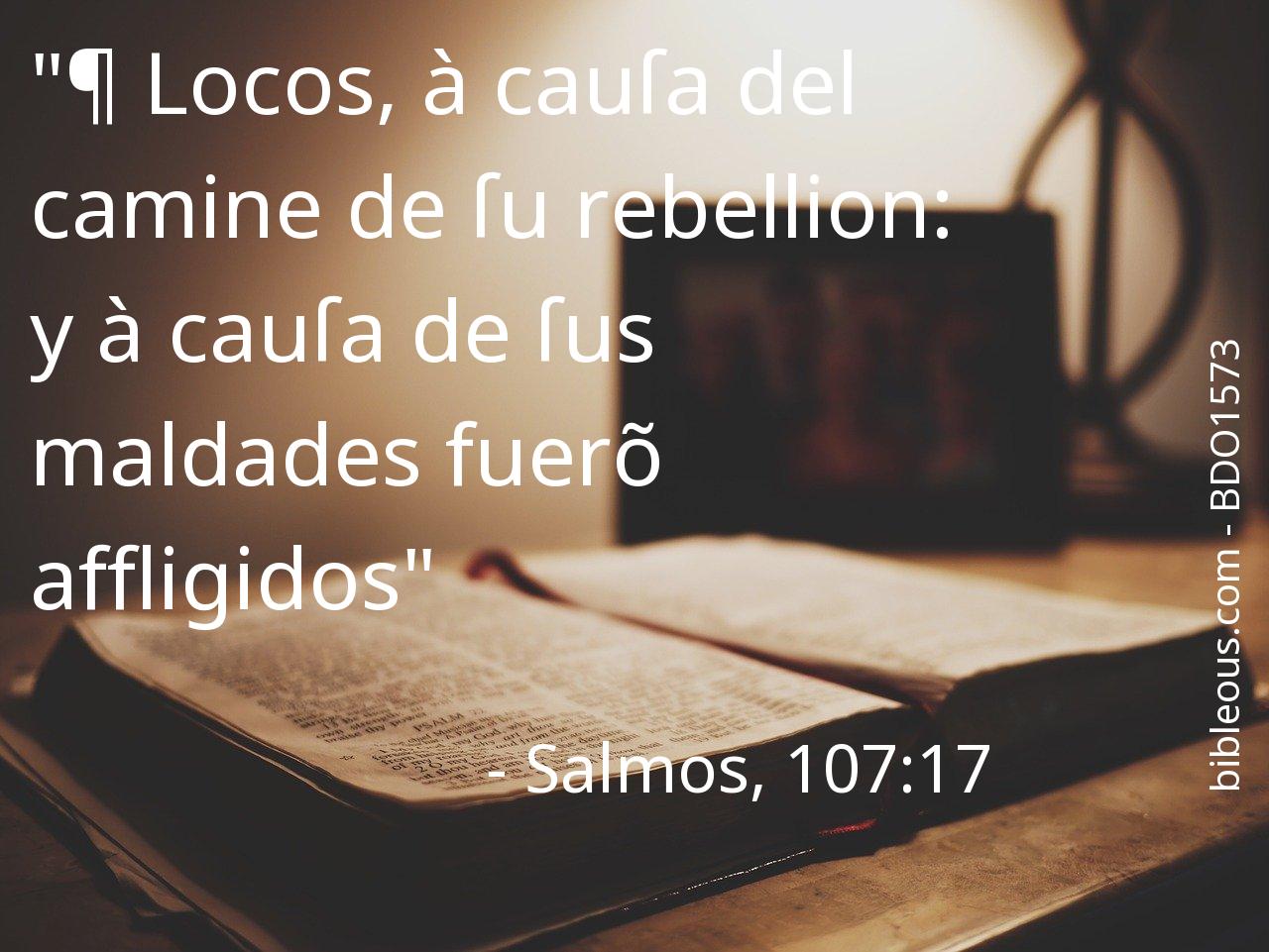 El versículo Salmos, 107:17 del capítulo 107 que nos presenta la versión 'Biblia del Oso 1573' de La Biblia resulta muy interesante para realizar una lectura reflexiva y tratar de profundizar en la sabiduría de sus palabras. ¿Qué quiso decirnos Dios con el versículo Salmos, 107:17? El capítulo 107 consta de 43 versículos, que pueden ayudar a contextualizar y ofrecer mejores referencias para comprender lo que el Padre quiere decirnos en el versículo Salmos, 107:17.