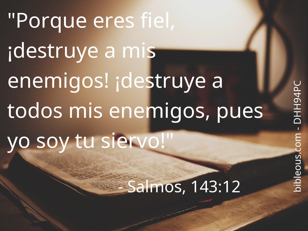 El versículo Salmos, 143:12 del capítulo 143 que nos presenta la versión 'Biblia Dios Habla Hoy' de La Biblia resulta muy interesante para realizar una lectura reflexiva y tratar de profundizar en la sabiduría de sus palabras. ¿Qué quiso decirnos Dios con el versículo Salmos, 143:12? El capítulo 143 consta de 12 versículos, que pueden ayudar a contextualizar y ofrecer mejores referencias para comprender lo que el Padre quiere decirnos en el versículo Salmos, 143:12.