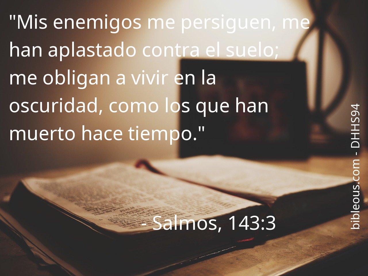 El versículo Salmos, 143:3 del capítulo 143 que nos presenta la versión 'Dios habla Hoy Estándar 1994' de La Biblia resulta muy interesante para realizar una lectura reflexiva y tratar de profundizar en la sabiduría de sus palabras. ¿Qué quiso decirnos Dios con el versículo Salmos, 143:3? El capítulo 143 consta de 12 versículos, que pueden ayudar a contextualizar y ofrecer mejores referencias para comprender lo que el Padre quiere decirnos en el versículo Salmos, 143:3.