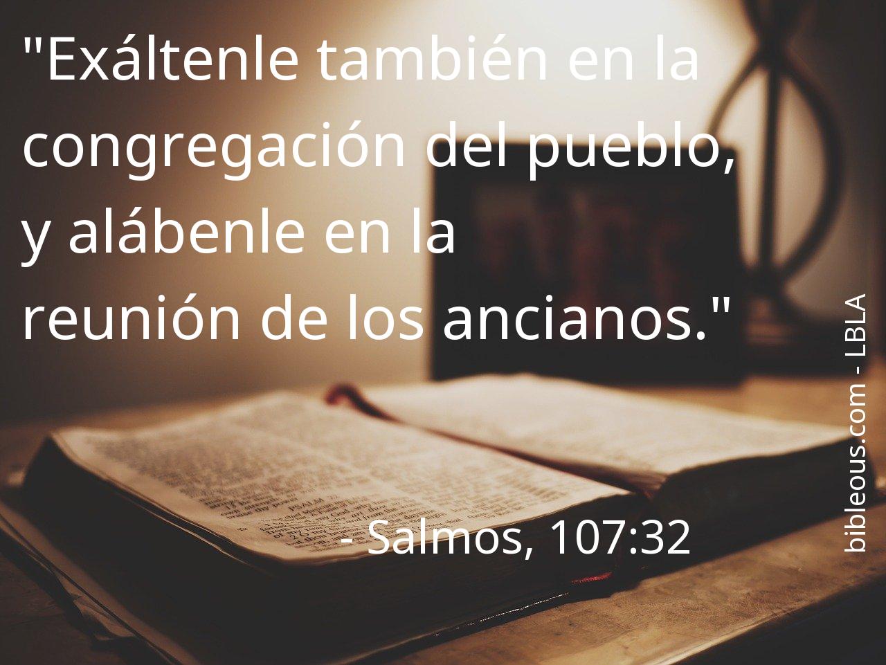 A pesar de todo, ninguna palabra escrita en la Biblia está de más. Ninguna palabra falta. La palabra del Señor se constata en las Sagradas Escrituras, ya sea en la versión 'La Biblia de las Américas' o en cualquier otra de las versiones de la Biblia. Por eso, reflexionar sobre el versículo Salmos, 107:32 del capítulo 107 del libro Salmos, nos ayuda a ser mejores cristianos y a acercarnos más a Dios. Es bueno recurrir al versículo Salmos, 107:32 en todas aquellas ocasiones en que nos pueda servir de guía para saber cómo actuar o para traer paz a nuestros corazones.