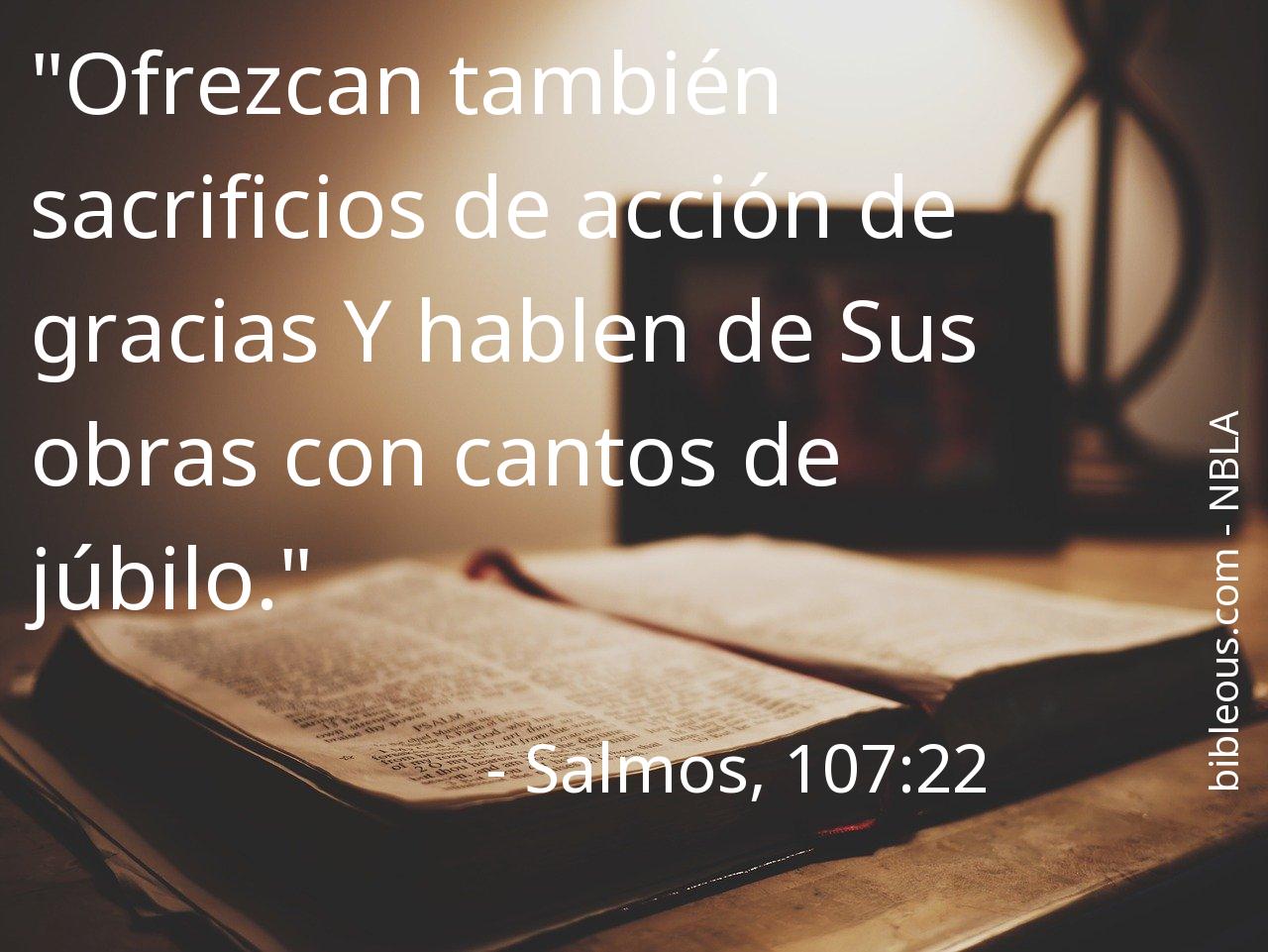A pesar de todo, ninguna palabra escrita en la Biblia está de más. Ninguna palabra falta. La palabra del Señor se constata en las Sagradas Escrituras, ya sea en la versión 'Nueva Biblia de las Américas' o en cualquier otra de las versiones de la Biblia. Por eso, reflexionar sobre el versículo Salmos, 107:22 del capítulo 107 del libro Salmos, nos ayuda a ser mejores cristianos y a acercarnos más a Dios. Es bueno recurrir al versículo Salmos, 107:22 en todas aquellas ocasiones en que nos pueda servir de guía para saber cómo actuar o para traer paz a nuestros corazones.