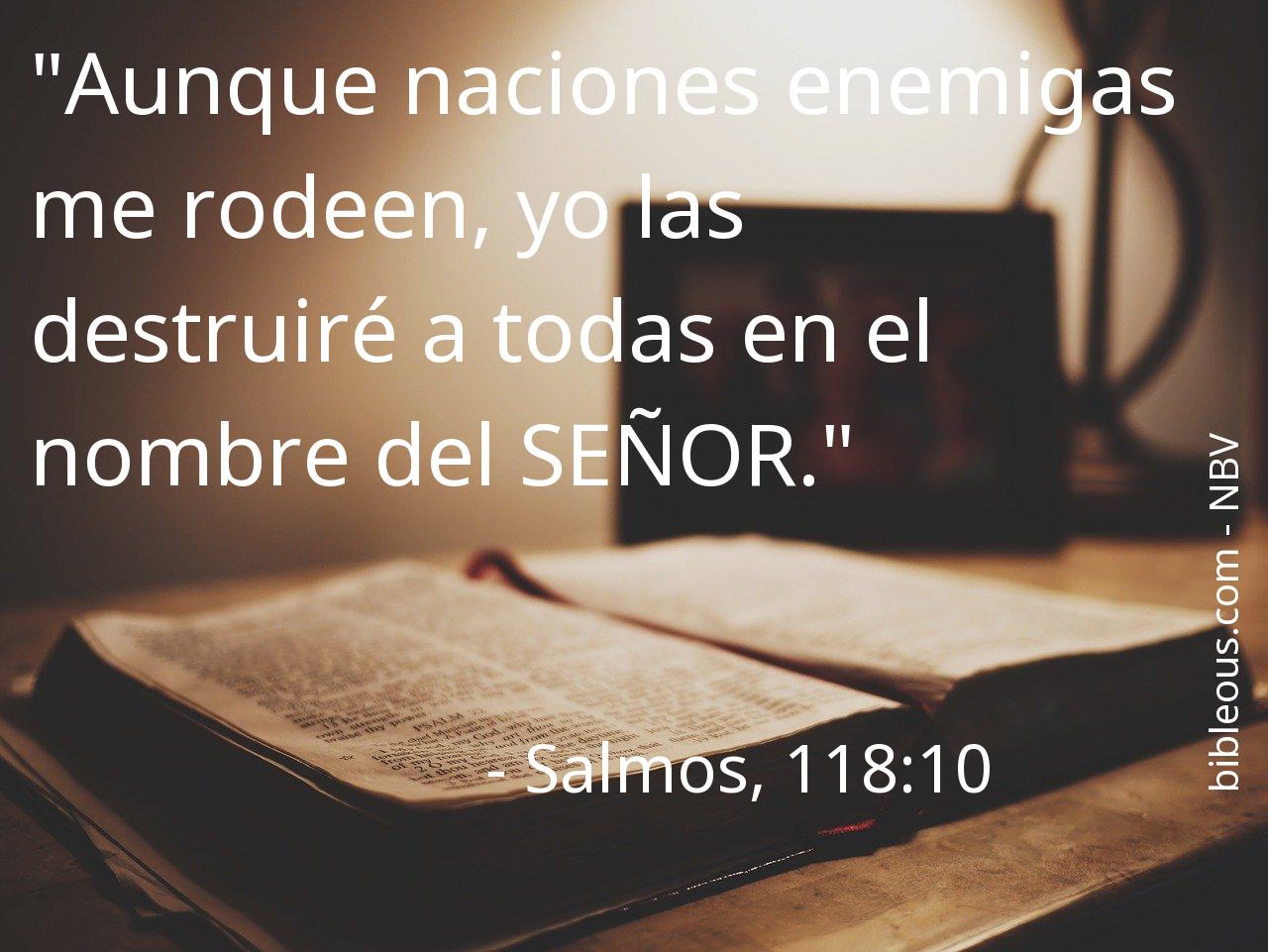 El versículo Salmos, 118:10 del capítulo 118 que nos presenta la versión 'Nueva Biblia Viva' de La Biblia resulta muy interesante para realizar una lectura reflexiva y tratar de profundizar en la sabiduría de sus palabras. ¿Qué quiso decirnos Dios con el versículo Salmos, 118:10? El capítulo 118 consta de 29 versículos, que pueden ayudar a contextualizar y ofrecer mejores referencias para comprender lo que el Padre quiere decirnos en el versículo Salmos, 118:10.