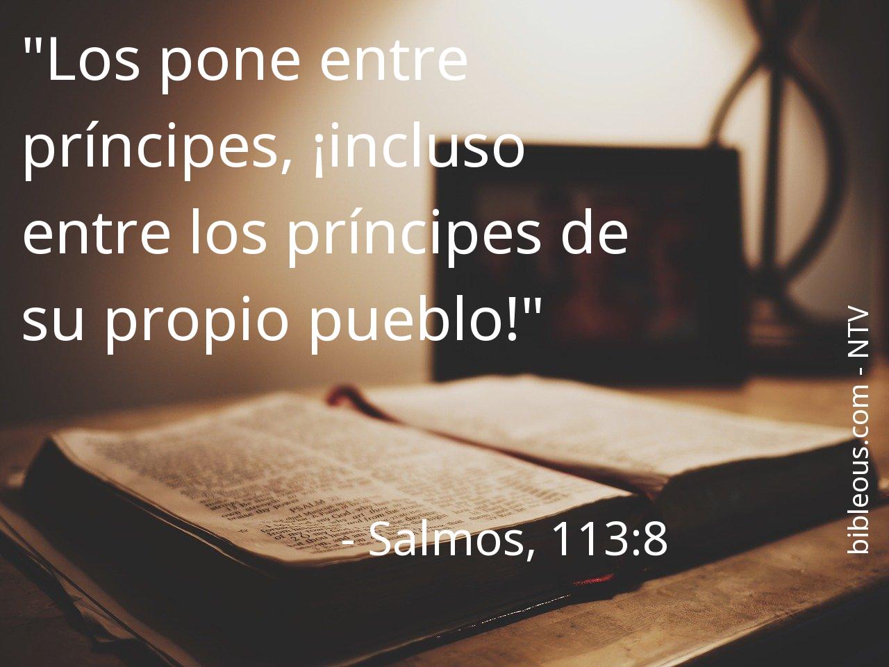 A pesar de todo, ninguna palabra escrita en la Biblia está de más. Ninguna palabra falta. La palabra del Señor se constata en las Sagradas Escrituras, ya sea en la versión 'Nueva Traducción Viviente' o en cualquier otra de las versiones de la Biblia. Por eso, reflexionar sobre el versículo Salmos, 113:8 del capítulo 113 del libro Salmos, nos ayuda a ser mejores cristianos y a acercarnos más a Dios. Es bueno recurrir al versículo Salmos, 113:8 en todas aquellas ocasiones en que nos pueda servir de guía para saber cómo actuar o para traer paz a nuestros corazones.