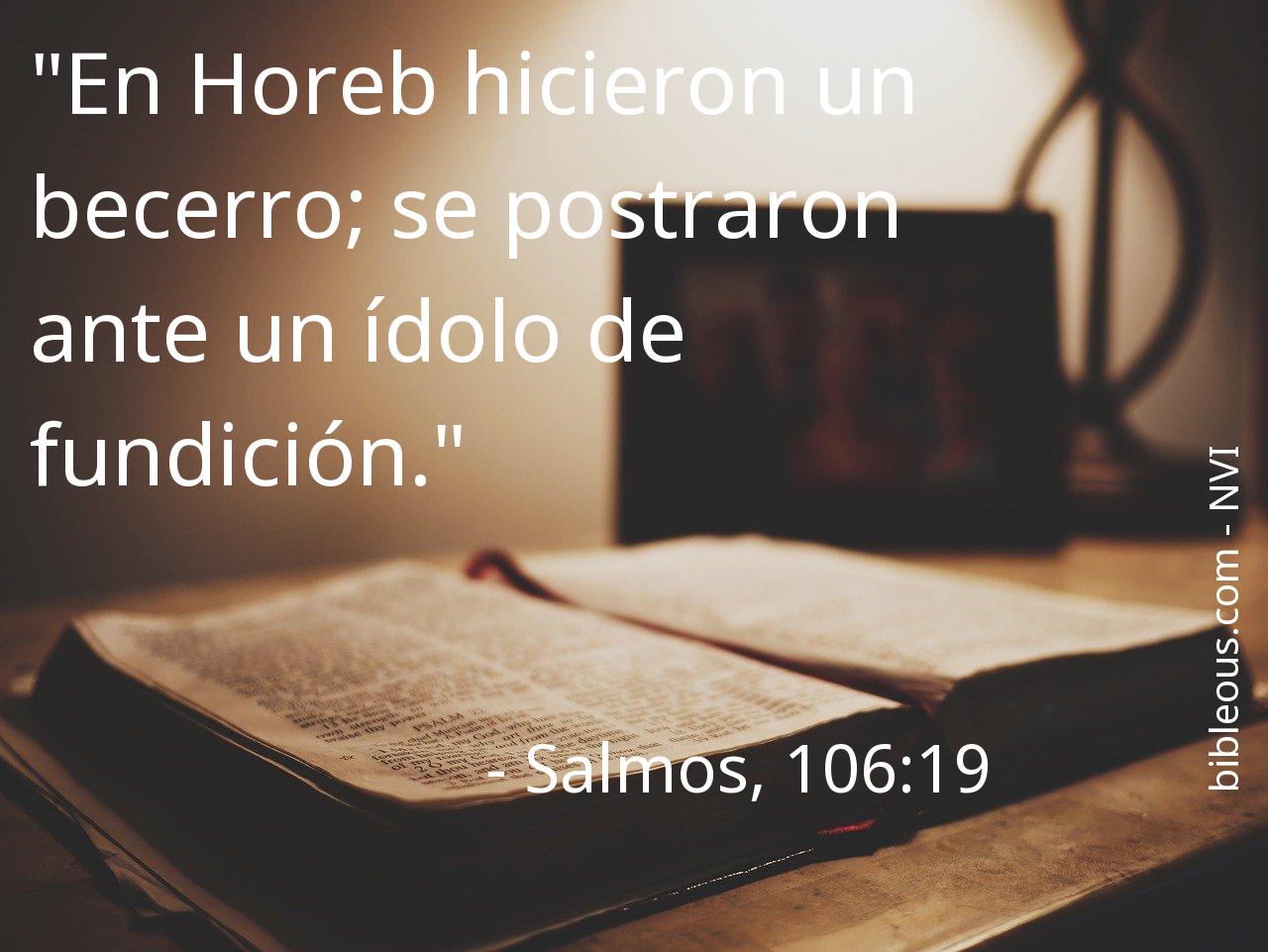 A pesar de todo, ninguna palabra escrita en la Biblia está de más. Ninguna palabra falta. La palabra del Señor se constata en las Sagradas Escrituras, ya sea en la versión 'Nueva Versión Internacional - Español' o en cualquier otra de las versiones de la Biblia. Por eso, reflexionar sobre el versículo Salmos, 106:19 del capítulo 106 del libro Salmos, nos ayuda a ser mejores cristianos y a acercarnos más a Dios. Es bueno recurrir al versículo Salmos, 106:19 en todas aquellas ocasiones en que nos pueda servir de guía para saber cómo actuar o para traer paz a nuestros corazones.