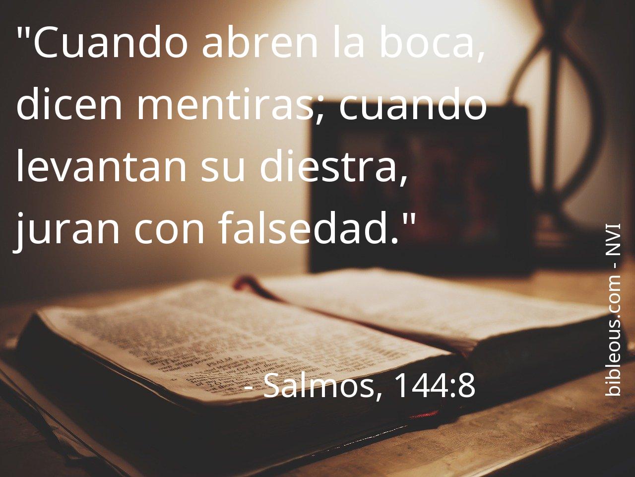El versículo Salmos, 144:8 del capítulo 144 que nos presenta la versión 'Nueva Versión Internacional - Español' de La Biblia resulta muy interesante para realizar una lectura reflexiva y tratar de profundizar en la sabiduría de sus palabras. ¿Qué quiso decirnos Dios con el versículo Salmos, 144:8? El capítulo 144 consta de 15 versículos, que pueden ayudar a contextualizar y ofrecer mejores referencias para comprender lo que el Padre quiere decirnos en el versículo Salmos, 144:8.