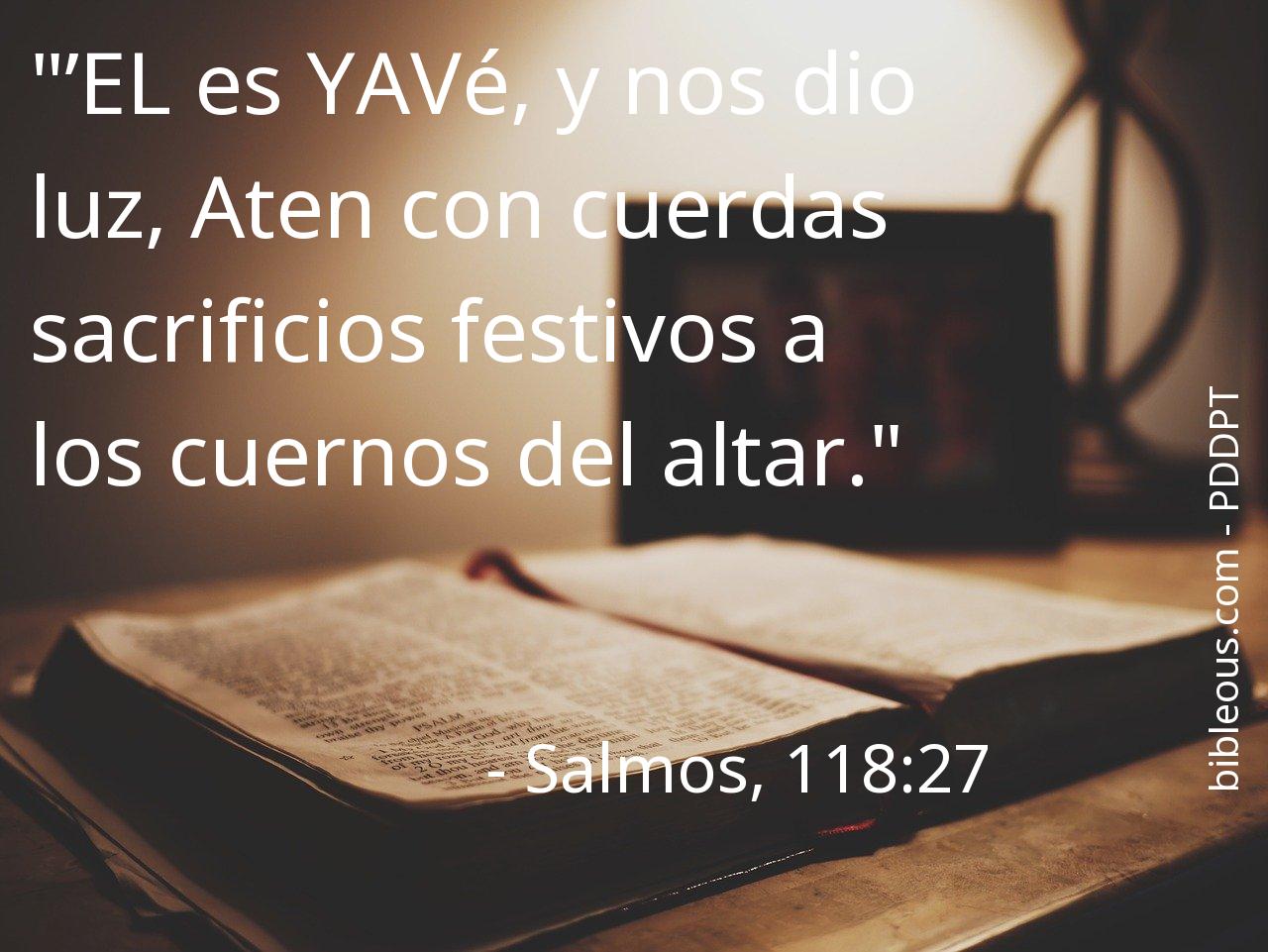 El versículo Salmos, 118:27 del capítulo 118 que nos presenta la versión 'Palabla de Dios para ti' de La Biblia resulta muy interesante para realizar una lectura reflexiva y tratar de profundizar en la sabiduría de sus palabras. ¿Qué quiso decirnos Dios con el versículo Salmos, 118:27? El capítulo 118 consta de 29 versículos, que pueden ayudar a contextualizar y ofrecer mejores referencias para comprender lo que el Padre quiere decirnos en el versículo Salmos, 118:27.