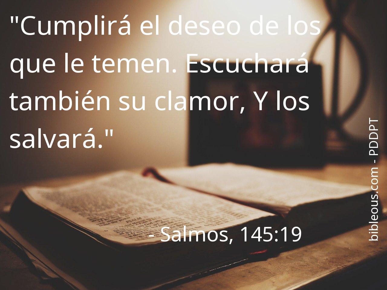 El versículo Salmos, 145:19 del capítulo 145 que nos presenta la versión 'Palabla de Dios para ti' de La Biblia resulta muy interesante para realizar una lectura reflexiva y tratar de profundizar en la sabiduría de sus palabras. ¿Qué quiso decirnos Dios con el versículo Salmos, 145:19? El capítulo 145 consta de 21 versículos, que pueden ayudar a contextualizar y ofrecer mejores referencias para comprender lo que el Padre quiere decirnos en el versículo Salmos, 145:19.