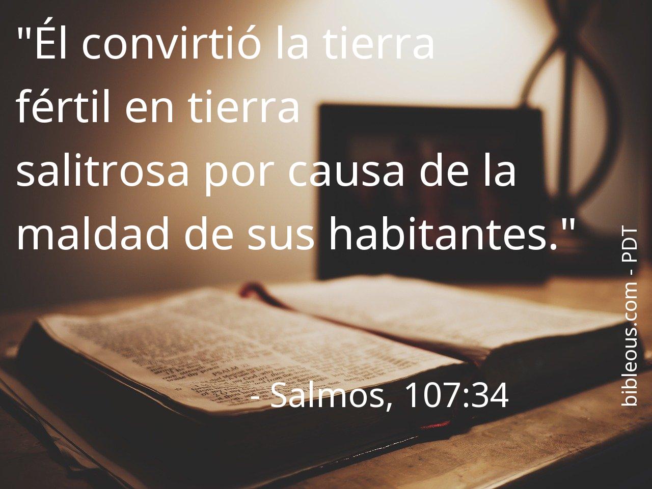 A pesar de todo, ninguna palabra escrita en la Biblia está de más. Ninguna palabra falta. La palabra del Señor se constata en las Sagradas Escrituras, ya sea en la versión 'La Biblia: La Palabra de Dios para todos' o en cualquier otra de las versiones de la Biblia. Por eso, reflexionar sobre el versículo Salmos, 107:34 del capítulo 107 del libro Salmos, nos ayuda a ser mejores cristianos y a acercarnos más a Dios. Es bueno recurrir al versículo Salmos, 107:34 en todas aquellas ocasiones en que nos pueda servir de guía para saber cómo actuar o para traer paz a nuestros corazones.