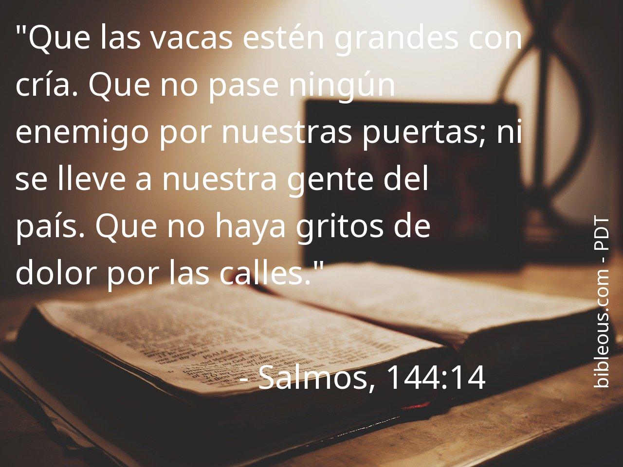 A pesar de todo, ninguna palabra escrita en la Biblia está de más. Ninguna palabra falta. La palabra del Señor se constata en las Sagradas Escrituras, ya sea en la versión 'La Biblia: La Palabra de Dios para todos' o en cualquier otra de las versiones de la Biblia. Por eso, reflexionar sobre el versículo Salmos, 144:14 del capítulo 144 del libro Salmos, nos ayuda a ser mejores cristianos y a acercarnos más a Dios. Es bueno recurrir al versículo Salmos, 144:14 en todas aquellas ocasiones en que nos pueda servir de guía para saber cómo actuar o para traer paz a nuestros corazones.