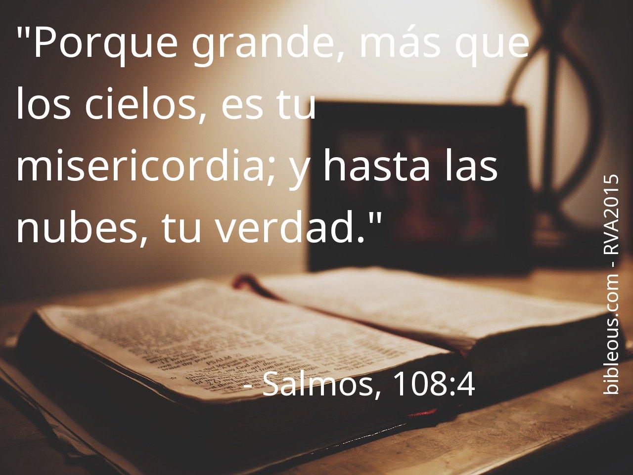 A pesar de todo, ninguna palabra escrita en la Biblia está de más. Ninguna palabra falta. La palabra del Señor se constata en las Sagradas Escrituras, ya sea en la versión 'Reina Valera Actualizada' o en cualquier otra de las versiones de la Biblia. Por eso, reflexionar sobre el versículo Salmos, 108:4 del capítulo 108 del libro Salmos, nos ayuda a ser mejores cristianos y a acercarnos más a Dios. Es bueno recurrir al versículo Salmos, 108:4 en todas aquellas ocasiones en que nos pueda servir de guía para saber cómo actuar o para traer paz a nuestros corazones.