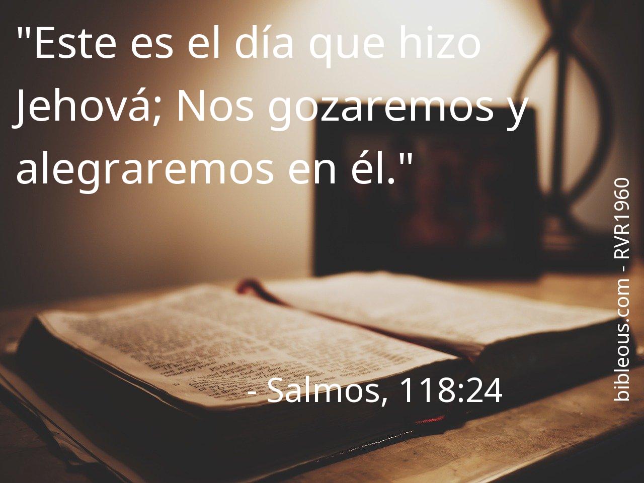 El versículo Salmos, 118:24 del capítulo 118 que nos presenta la versión 'Biblia Reina Valera 1960' de La Biblia resulta muy interesante para realizar una lectura reflexiva y tratar de profundizar en la sabiduría de sus palabras. ¿Qué quiso decirnos Dios con el versículo Salmos, 118:24? El capítulo 118 consta de 29 versículos, que pueden ayudar a contextualizar y ofrecer mejores referencias para comprender lo que el Padre quiere decirnos en el versículo Salmos, 118:24.