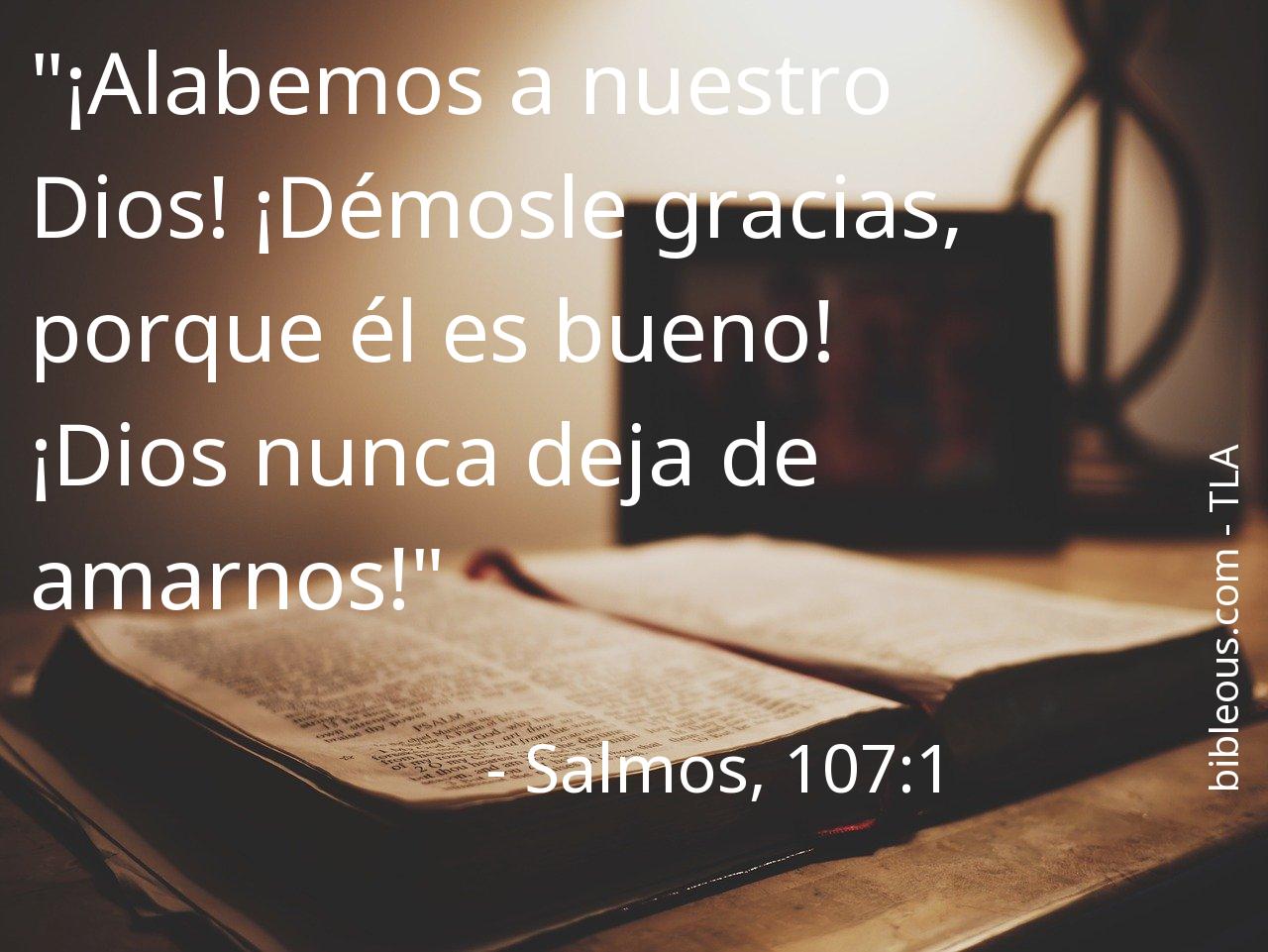 A pesar de todo, ninguna palabra escrita en la Biblia está de más. Ninguna palabra falta. La palabra del Señor se constata en las Sagradas Escrituras, ya sea en la versión 'Traducción en Lenguaje Actual' o en cualquier otra de las versiones de la Biblia. Por eso, reflexionar sobre el versículo Salmos, 107:1 del capítulo 107 del libro Salmos, nos ayuda a ser mejores cristianos y a acercarnos más a Dios. Es bueno recurrir al versículo Salmos, 107:1 en todas aquellas ocasiones en que nos pueda servir de guía para saber cómo actuar o para traer paz a nuestros corazones.