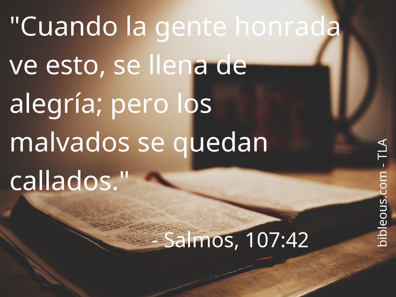 A pesar de todo, ninguna palabra escrita en la Biblia está de más. Ninguna palabra falta. La palabra del Señor se constata en las Sagradas Escrituras, ya sea en la versión 'Traducción en Lenguaje Actual' o en cualquier otra de las versiones de la Biblia. Por eso, reflexionar sobre el versículo Salmos, 107:42 del capítulo 107 del libro Salmos, nos ayuda a ser mejores cristianos y a acercarnos más a Dios. Es bueno recurrir al versículo Salmos, 107:42 en todas aquellas ocasiones en que nos pueda servir de guía para saber cómo actuar o para traer paz a nuestros corazones.