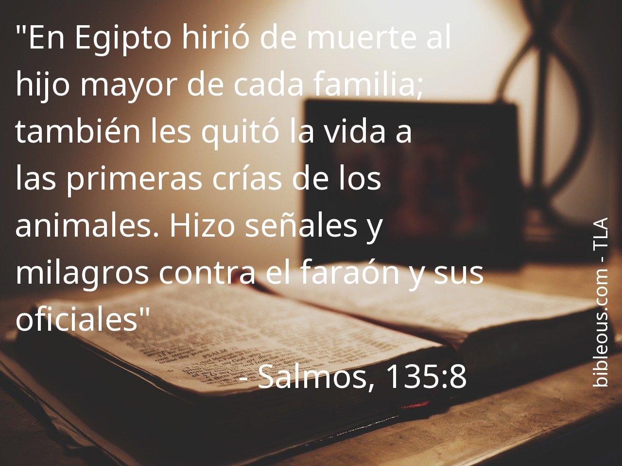 A pesar de todo, ninguna palabra escrita en la Biblia está de más. Ninguna palabra falta. La palabra del Señor se constata en las Sagradas Escrituras, ya sea en la versión 'Traducción en Lenguaje Actual' o en cualquier otra de las versiones de la Biblia. Por eso, reflexionar sobre el versículo Salmos, 135:8 del capítulo 135 del libro Salmos, nos ayuda a ser mejores cristianos y a acercarnos más a Dios. Es bueno recurrir al versículo Salmos, 135:8 en todas aquellas ocasiones en que nos pueda servir de guía para saber cómo actuar o para traer paz a nuestros corazones.