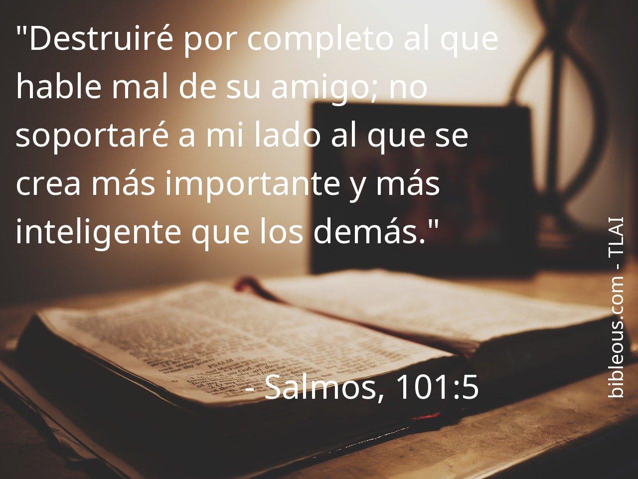 A pesar de todo, ninguna palabra escrita en la Biblia está de más. Ninguna palabra falta. La palabra del Señor se constata en las Sagradas Escrituras, ya sea en la versión 'Traducción en Lenguaje Actual Interconfesional' o en cualquier otra de las versiones de la Biblia. Por eso, reflexionar sobre el versículo Salmos, 101:5 del capítulo 101 del libro Salmos, nos ayuda a ser mejores cristianos y a acercarnos más a Dios. Es bueno recurrir al versículo Salmos, 101:5 en todas aquellas ocasiones en que nos pueda servir de guía para saber cómo actuar o para traer paz a nuestros corazones.